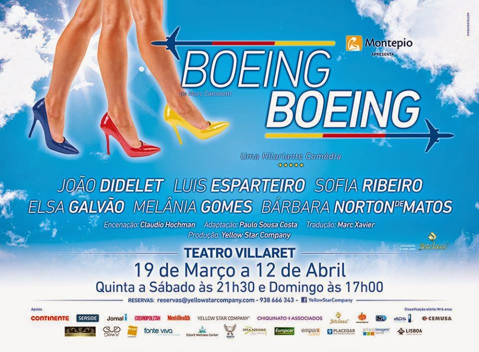 O "Mário Lisboa entrevista..." tem o prazer de apoiar a peça "Boeing Boeing" de Marc Camoletti, encenada por Claudio Hochman e protagonizada por João Didelet (http://mlisboaentrevista.blogspot.pt/2012/07/mario-lisboa-entrevista-joao-didelet.html), Luís Esparteiro, Sofia Ribeiro, Elsa Galvão (http://mlisboaentrevista.blogspot.pt/2011/08/mario-lisboa-entrevista-elsa-galvao.html), Melânia Gomes e Bárbara Norton de Matos, na qual está em cena no Teatro Villaret até ao próximo dia 12 de Abril.